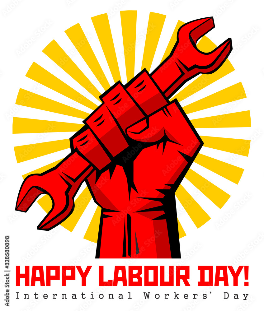 Happy Labour Day Vector Label With Strong Red Fist With Wrench Happy Labor Day Workers Day May Day Poster Or Greeting Card Illustration Vector Stock Vektorgrafik Adobe Stock